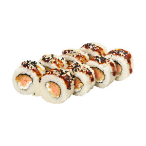 Лосось темпура, сыр, соус унаги, кунжут белый, кунжут черный.