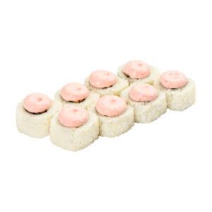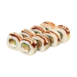 Белая рыба, огурец, сыр, соус унаги, соус спайси.